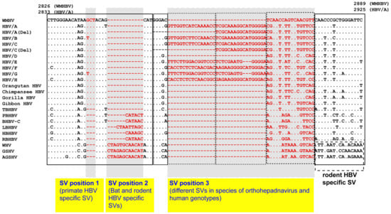 In a previous study, SV polymorphisms of human HBV genotypes A to H were identified in the Pre-S1 region [30]. Subsequent analyses focused on Pre-S1 SVs in bat and rodent (woodchuck and squirrel) HBVs. Primate-, bat- and rodent-specific SVs have all been observed in this area (Figure 4) [69].