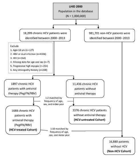 Figure 1 presents the flowchart for study patient recruitment from the LHID2000 database. We first identified 18,299 patients who had received a first diagnosis of chronic HCV infection (International Classification of Diseases, Ninth Revision, Clinical Modification (ICD-9-CM) codes 070.41, 070.44, 070.51, 070.54,070.70,070.71 and V02.62) between January 1, 2000, and December 31, 2013. Patients who received a second diagnosis of HCV infection 6 months after being diagnosed as having acute or unspecified HCV were classified as having chronic HCV. We selected the date of antiviral therapy as the index date. We also excluded patients aged < 18 years (n = 127) and those with chronic hepatitis B virus infection (ICD-9-CM codes 070.2, 070.3, and V02.61; n = 4306), human immunodeficiency virus infection (ICD-9-CM codes 042, 043, 044, V08, and 795.8, n = 164), missing data for age or sex (n = 7), progressive high myopia (ICD-9-CM code 360.21, n = 154), and any retinal vascular events (ICD9-CM codes 362.35, 362.36, and 362.37 for retinal venous occlusion; 362.31, 362.32, 362.33, and 362.34 for retinal arterial occlusion; 362.81 for retinal hemorrhage; and 362.30, 362.82, and 362.83 for unspecified types; n = 208) prior to the index date. After frequency matching by age, sex, and year of index date at a 1:2 ratio, 1688 patients with HCV infection who received PegIFN/RBV treatment were included in the HCV-treated cohort and 3376 patients with HCV infection without PegIFN/RBV treatment were included in the HCV-untreated cohort. For the non-HCV cohort, we retrieved data from the remainder of the NHI enrolees in the LHID2000 and applied the same exclusion criteria as those used for the HCV cohort. We performed frequency matching by age, sex, and year of the index date at a 1:10 ratio (HCV-treated:non-HCV = 1:10) to select the comparison cohort participants. Consequently, 16,880 patients were included in the non-HCV cohort. Each patient was individually followed up for 2 years after their index date to identify those who developed any retinopathy events. The date of first diagnosis of any retinopathy type during the follow-up period or by the end of the study was considered the study endpoint.