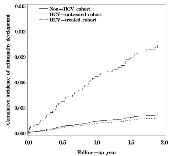 The survival curve revealed a significant difference in the cumulative incidence of any retinopathy among the HCV-treated, HCV-untreated, and non-HCV cohorts (log-rank test, p < 0.05; Figure 2). The 2-year cumulative incidence of any retinopathy was approximately 0.89% in the HCV-treated cohort, 0.15% in the HCV-untreated cohort, and 0.19% in the non-HCV cohort.