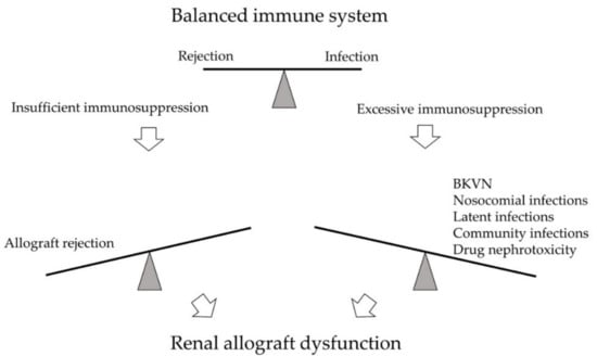 The immune system of kidney transplant recipients is balanced between rejection and infection. Excessive immunosuppression may lead to infections, such as BK polyomavirus nephropathy (BKVN), nosocomial infections, latent infections, and community infections. Drug nephrotoxicity may also develop. On the opposite side, insufficient immunosuppression may result in allograft rejection. Both arms may cause significant kidney damage and renal allograft dysfunction.