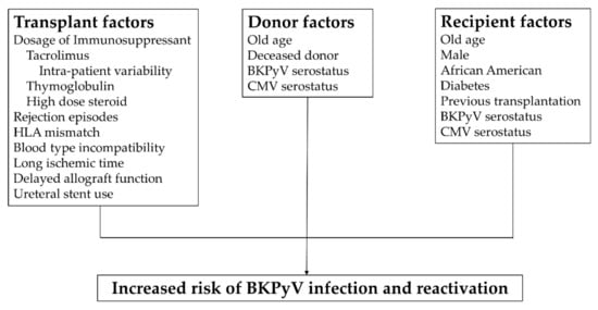 Risk factor identification for BKPyV is essential. The studied risk factors for BKPyV infection can be assorted into several categories: Donor risk factors, recipients risk factors, and transplant risk factors (Figure 2) [16,18,39,56,62,63,64,65,66,67,68,69,70,71,72]. A systemic review revealed the most relevant risk factors for BKPyV viremia after kidney transplantation were a tacrolimus regimen, a deceased donor, a male recipient, a history of the previous transplant, age at transplantation, ureteral stent use, delayed graft function, and acute rejection episodes [73]. Due to the low frequency of the BKVN, the sample size of each study is small; therefore, it is difficult to reach statistically significant results in BKVN studies. Prince et al. enrolled 34 BKVN patients in a single-center and reported that tacrolimus, mycophenolate mofetil (MMF), and acute rejection were significant risk factors for BKVN [74]. Pai et al. published another single-center retrospective study, where 14 BKVN patients were assessed for associated risk factors of BKVN. Episodes of rejection, transplantation of >1 organ, positive cytomegalovirus (CMV) serology in both donor and recipient, and a more significant cumulative dose of daclizumab use at the time of induction were statistically significant risk factors for the development of BKVN [69]. Prince et al. suggested that BKVN only manifests while the host immunity is over-suppressed, whereas acute rejection independently plays a role regardless of therapeutic regimens [74]. Hence, understanding pre- and post-transplant risk factors can be helpful to balance the infection and rejection.