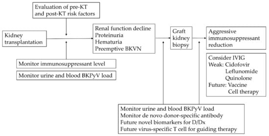 BKPyV reactivation is induced by relative or absolute immunodeficient status, such as pregnancy, cancer, HIV infection, and diabetes [60]. Typical BKPyV reactivation occurs early after transplantation or after over immunosuppression [61]. BKPyV infection or reactivation can be managed by balancing the immune system. In other words, IS dose should be delicately reduced to avoid allograft rejection. In this part, we discuss methods to reduce the possibility of infection or reactivation in addition to the management strategies of BKPyV infection.