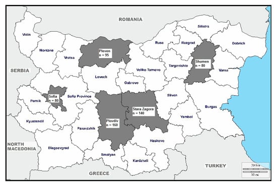 The Bulgarian territory is divided into 28 administrative districts. Five hundred and fifty-five blood samples were collected from non-remunerated blood donor voluntaries (n = 555) enrolled from five districts (Figure 1). The geographic distribution of the investigated blood donors was spread across several large districts in Bulgaria, including Shumen (approximately 26°67′ E and 27°22′ E longitude; 42°99′ N and 43°61′ N latitude), Pleven (approx. 24°06′ E and 25°12′ E longitude; 43°16′ N and 43°64′ N latitude), Stara Zagora (approx. 25°11′ E and 25°87′ E longitude; 42°14′ N and 42°40′ N latitude), Plovdiv (approx. 24°48′ E and 25°12′ E longitude; 41°49′ N and 42°37′ N latitude), and Sofia (approx. 22°40′ E and 23°34′ E longitude; 42°34′ N and 42°80′ N latitude). The total population in these districts is as follows: Shumen, 172,262 people; Pleven, 236,305; Stara Zagora, 313,396; Plovdiv, 666,801; and Sofia, 1,328,790 []. The blood samples were collected from 1 June 2020 to 31 October 2020. The collection of blood samples was carried out through blood donation campaigns in the five districts of Bulgaria mentioned above.