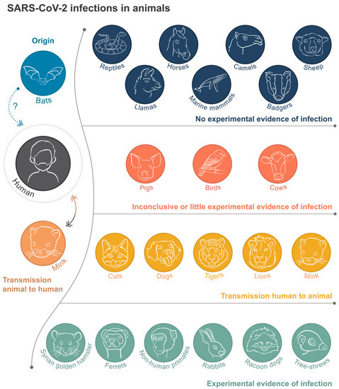 Coronaviruses, such as the one that caused COVID-19, are enveloped, single-stranded, positive-sense RNA viruses. They possess the largest genome of the RNA viruses with four open reading frames (ORFs) that code for the main structural proteins: the Spike (S), Membrane (M), Envelope (E), and Nucleocapsid (N) [7]. Like its 2003 predecessor, SARS-CoV-2 is now known to adhere to the host angiotensin-converting enzyme-2 (ACE2) receptor via its receptor-binding domain (RBD) of the viral S protein [8]. ACE-2 receptors can be found on a variety of cell types in the human body—in particular, the oral and nasopharyngeal mucosae, lung, gastrointestinal tract, liver, kidney, and brain [9]. Modeling studies have predicted that SARS-CoV-2 can bind to several animal species’ ACE2 receptors, including those of pigs, cats, ferrets, and nonhuman primates, with varying accuracy [10]. However, these modeling studies do not replace the experimental evidence of SARS-CoV-2 infections in these animals, which we focus upon here in an attempt to understand which animals are susceptible to SARS-CoV-2 infection (Figure 1).