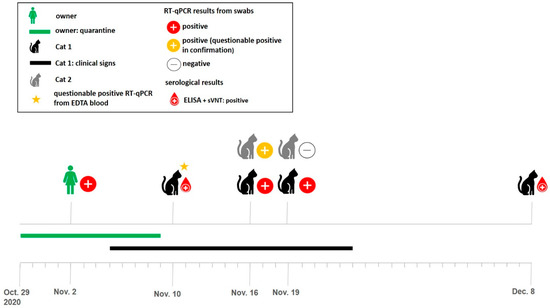 The two cats reported in this study lived in a COVID-19-affected household in the northern part of the canton of Zurich, Switzerland. The household consisted of two people living with their two cats. One owner had tested positive for SARS-CoV-2 RT-PCR on 2 November 2020 (Viollier AG, Allschwil, Switzerland; Figure 1), after both owners had developed respiratory symptoms in the week prior. The positive tested owner reported muscle pain, anosmia, cough, sore throat, and nasal discharge. The other person experienced only mild symptoms. They underwent quarantine until 9 November 2020.