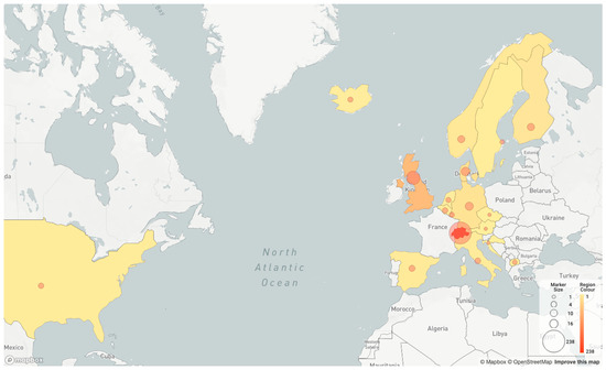 Geographic distribution of isolates from lineage B.1.1.39 according to pangolin [60]. France (2), Rwanda (1), New Zealand (1), Australia (1), Czech Republic (1), and Croatia (1) are not shown in the map generated with pangolin, but the countries reported isolates from the B.1.1.39 lineage, according to GISAID.org (isolate number in brackets).