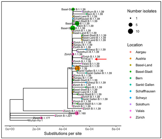 Phylogenetic tree showing the relationship between the isolate from Cat 1 and related isolates from humans (69 most genetically similar isolates from the Global Initiative on Sharing All Influenza Data (GISAID) according to nonsynonymous mutations and ten isolates representative of the predominant lineages circulating in Zurich during November 2020). Clades of isolates from the same pangolin lineage collected in the same location are collapsed [60]. The phylogenetic position of Cat 1 is indicated with the red arrow and gray dot.