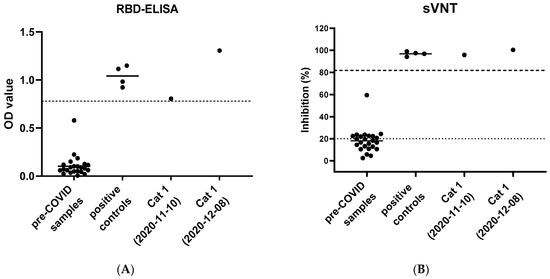 The serological results of Cat 1 were confirmed by the Virology Division of the Faculty of Veterinary Medicine, University of Utrecht by a virus neutralization test with a pseudotyped SARS-CoV-2 spike protein as described previously [70,71]. Additionally, the result was confirmed by the Friedrich–Loeffler Institute (FLI, Greifswald–Insel Riems, Germany) using a RBD-ELISA, an indirect immunofluorescence assay and a surrogate virus neutralization test as described previously [45,69,72].