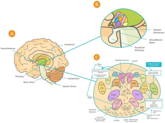 Schematic representation of the functional structure of hypothalamic circuits. (A) Location of hypothalamus within the ventral part of the diencephalon. (B) Location of hypothalamus in relation to the median eminence, infundibular stem, and pituitary glands. (C) Patterns of functional interaction between the hypothalamic nuclei (reproduced with permission from []). Abbreviations: AN: arcuate nucleus; AgRP: Agouti-related protein; AVP: arginine vasopressin; BBB: Blood brain barrier; CART: cocaine and amphetamine-regulated transcript; CRH: corticotrophin releasing hormone; GLP-1: Glucagon-like peptide-1; VMN: ventromedial nucleus; OT: oxytocin; DMN: dorsomedial nucleus; PVN: periventricular nucleus; DHA: dorsal hypothalamic area; IR: insulin receptor; PFA: perifornical area; LHA: lateral hypothalamic area; MCH: Melanin-concentrating hormone; MSH: melanocyte-stimulating hormones; CN: suprachiasmatic nucleus; SON: supraoptic nucleus; POA: preoptic area; POMC: Pro-opiomelanocortin; PPY: Polypeptide; ObRb: Leptin receptor; MB: mammillary bodies; ME: median eminence; NPY: Neuropeptide; III-V: third ventricle; TRH, thyrotropin-releasing hormone.