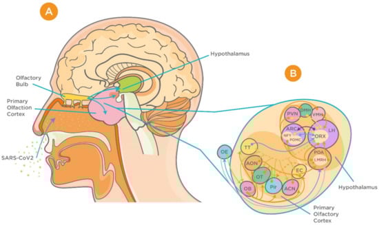 It has been demonstrated that the hypothalamus has complex anatomical and functional connections with the olfactory bulb. Several neuropeptides including gonadotropin-releasing hormone, neuropeptide Y, leptin, adiponectin, and orexins are involved in modulation of these connections [,,,,,] (Figure 2). In addition, studies on influenza viruses, which share several commonalities with the CoVs, have demonstrated high viral antigen expression in the olfactory bulb accompanied by cytokine induction within the bulb and hypothalamus upon intranasal infection []. It is noteworthy that these cytokines, which include tumor necrosis factor alpha (TNF-α) and interleukin 1β (IL-1β), play a critical role in triggering acute-phase responses to viral infection []. In agreement with previous reports, more recent evidence has demonstrated MRI alteration in the olfactory cortex of patients with COVID-19, indicating the involvement of the olfactory system in the viral neuroinvasion []. This became more evident using 3- and 2-dimensional fluid-attenuated inversion recovery images, which showed cortical hyperintensity in the right gyrus rectus and hyperintensity in the olfactory bulbs [].