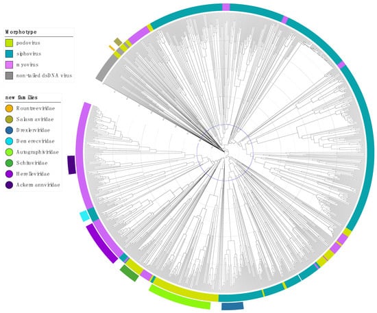 Dendrogram generated by GRAViTy (http://gravity.cvr.gla.ac.uk, accessed on 5 February 2021) for DB-B: Baltimore Group Ib—Prokaryotic and archaeal dsDNA viruses (VMRv34) and annotated using iTOL [,]. The inside coloured ring indicates the morphotype and the outside ring the new proposed and ratified families as of 2021. The distance from tip to node, indicated by the scale rings, represents the composite generalised Jaccard distance (0–1) between two genomes calculated based on relatedness of the proteins and the genome organisation, where 0 is identical and 1 is no measurable relation between two genomes. The Jaccard distance of 0.8, unifying the majority of eukaryotic virus families is indicated in blue for illustration purposes. Bootstrap values (0–1) are indicated by branch colour on a greyscale, from light grey (0) to black (1), showing that the majority of branches are well-supported. Bootstrap values were calculated as described by Aiewsakun and Simmonds [] by random resampling of the protein profile hidden Markov models that form the basis of the protein relatedness score, recomputing the pairwise distance matrix and then recomputing the dendrogram and repeating this 100 times.