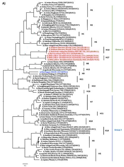 In 2009–2010, a novel influenza virus was discovered by pan-rtPCR and sequencing, and its full-genome sequence was then determined by next-generation sequencing from samples collected from New World yellow-shouldered fruit bats (Sturnira lilium) in Guatemala [24]. Although the identified viral genome conforms to the characteristics of IAV genomes and each gene segment is a close match with those of the IAVs, they were phylogenetically distinct from those of known IAVs (Figure 1) [24,28]. Analysis of the hemagglutinin (HA) genes suggests that the HA gene is closer to those in the Group 1 (H1, H2, H5, H6, H8, H9, H11, H12, H13, and H16) than those in the Group 2 (H3, H4, H7, H10, H14, and H15) and forms a separate branch (Figure 1A) [29].
