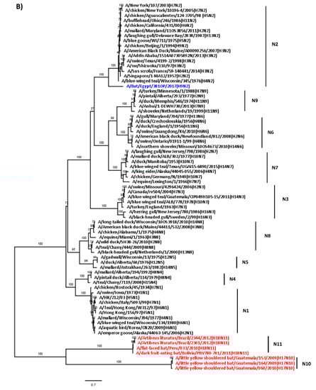 - Kandeil, A.; Gomaa, M.R.; Shehata, M.M.; El Taweel, A.N.; Mahmoud, S.H.; Bagato, O.; Moatasim, Y.; Kutkat, O.; Kayed, A.S.; Dawson, P.; et al. Isolation and Characterization of a Distinct Influenza A Virus from Egyptian Bats. J. Virol. 2019, 93. [Google Scholar] [CrossRef]