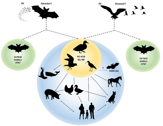 The discovery of bat influenza viruses changes and extends our knowledge on IAVs. Bats are the second largest group of mammals with more than 1400 recognized species. At least four species bats (Sturnira Lilium, Artibeus planirostris, Artibeus obscurus, and Artibeus lituratus) found in central and South America harbor bat influenza viruses [24,25,26]. Although different species of bats show different susceptibility to the same virus, frequent contact and exposure to bat influenza virus provides the opportunity to evolve and adapt in new hosts. Serological studies have shown that not only the specific bat species in which influenza viral nucleotides has been detected, but also other bat species have antibodies to either H17N10 and/or H18N11 antigens [24,25,26]. This indicates that the circulating areas and host species of bat influenza viruses likely exceeds what are currently known. To date, both H17N10 and H18N11 virus sequences as well as the novel H9N2-like virus have been detected only in bats, suggesting that bat influenza viruses continue to spread in bats and have evolved in bats for a substantial amount of time. It is possible that other novel subtypes of IAVs exist and circulate in bats, which warrants further surveillance in bat populations. In addition, an important question raised is whether IAVs originated from bats or birds. There are two hypotheses (Figure 2) on this question: (1) all IAVs originate from bats. This opinion is based on phylogenetic backdating of the internal genes which suggests that the precursor of the New World bat H17N10 and H18N11 IAV segments branched off more than 650 years ago and that the last common ancestor of Old World bat H9N2-like IAVs and conventional IAVs is around 300 years old; (2) all IAVs originate from avian species, because it is possible that an even older IAV precursor than the one found in New World bats was circulating in avian species, which was then introduced into mammals, including bats [30].