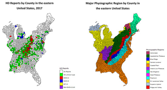 In 2017, there was a large HD outbreak in the eastern United States. The majority of HD activity was associated with EHDV-2, although EHDV-6 was detected in multiple states for the first time. Additionally, there was a large outbreak of EHDV-2 which appeared to be associated with the Appalachian Plateau physiographic region. These noteworthy changes in the epidemiology of HD prompted an investigation into the relationship between HD outbreaks and physiographic regions. The objective of this study was to determine if the 2017 HD outbreak in white-tailed deer was correlated with a specific physiographic region, the Appalachian Plateau. We hypothesized that the outbreak was spatially dependent on physiographic region. To investigate this relationship, we conducted an analysis on HD county-level reports from the eastern United States.