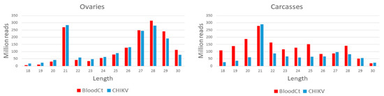 Size distribution of small RNAs reads mapping to the Aedes albopictus genome from ovary and carcass samples. Reads from chikungunya (CHIKV)-infected and uninfected samples are in blue and red, respectively.