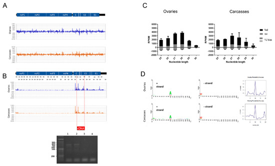 Small RNA response against the infecting CHIKV. (A) siRNA profile along the CHIKV genome. Values on the y-axis represent quantification of the signal as Reads Per Kilobase Million (RPKM). (B) piRNA profile along the CHIKV genome and PCR amplification of the vDNA fragment. Wells 1 and 2 show the PCR results from the DNA of the two biological replicates of CHIKV-infected ovaries; wells 3–4 show the PCR results from the DNA of the corresponding un-infected controls. The red box indicates the position in which the vDNA fragment was identified. (C) Read size distribution of piRNA reads in forward (black), reverse (grey), and displaying 1U bias (dots). (D) Nucleotide bias at each position of piRNAs against CHIKV mapping to the sense (+) strand (left panel) and antisense (−) strand (right panel) in ovaries and carcasses, and corresponding PingPong overlap probabilities.