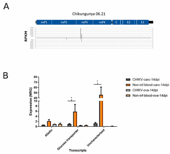 (A) Graphical representation of the hotspots on the viral genome for small RNA molecules that map to both CHIKV and Ae. albopictus transcripts. (B) Bar plot of the qPCR results on three candidate target transcripts of viral small RNA molecules: afadin (XM_029860564.1), glucose- transporter (XM_029879742.1), and uncharacterized transcript (XM_029866737.1). ANOVA significant results at p < 0.05 are indicated by an asterisk.