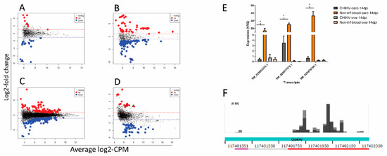 Differential abundance of small RNA molecules mapping to Ae. albopictus transcripts represented by average log counts-per-million (CPM) on the x-axis and log fold-change on the y- axis. Red dots indicate significantly over-expressed sRNAs and blue dots significantly under-expressed sRNAs upon infection compared to un-infected controls. Statistical significance of the data was assessed by likelihood ratio test. (A) siRNA abundance of transcripts in CHIKV-infected ovaries; (B) siRNA abundance of transcripts in CHIKV-infected carcasses; (C) piRNA abundance of transcripts in CHIKV-infected ovaries; (D) piRNA abundance of transcripts in CHIKV-infected carcasses. Triangles indicate transcripts tested by qPCR. (E) Bar plot of the qPCR results on transcripts to which SDA small RNAs are mapped to. Significant results at p < 0.05 are indicated by an asterisk. Significance was established by ANOVA. (F) Normalized coverage of the Ae. albopictus genomic region NW_021838576.1:117401889-117402177. The two shades of grey represent the biological replicates. Query bar indicates alignment similarity to XM_029878700.1 as computed by BLASTn online.
