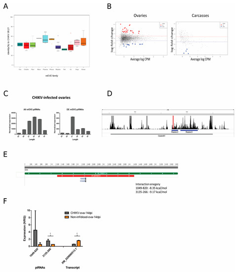 The following are available online at https://www.mdpi.com/article/10.3390/v13040553/s1, Figure S1: (A) Scheme of the infection experiments. (B) Strategy used to study the small RNA profile of nrEVEs, Figure S2: Length distribution of the full collection of Aedes aegypti miRNAs downloaded from miRbase, Figure S3: Venn diagram representing the intersection of the sRNA differential abundance across each transcript based on the three different library sizes for normalization, Figure S4: Hairpin predictions computed with miRNAFold, Figure S5: Bar plot of significantly enriched pathways based on differential sRNA abundance in CHIKV-infected ovaries and carcasses, Figure S6: Venn diagram of the transcripts displaying differential abundance across conditions, Figure S7: Venn diagram representing the intersection of the sRNA differential abundance across each nrEVE based on the three different library sizes for normalization, Table S1: List of primers used in this study, Table S2: List of candidate targets of potential viral-sRNAs, Table S3: List of transcripts displaying significant differential abundance for siRNAs, Table S4:. GO enrichment analysis of siRNA SDA transcripts, Table S5: List of transcripts displaying significant differential abundance for piRNAs, Table S6: KOBAS gene-list enrichment analysis of SDA transcripts, Table S7: List of candidate targets of DE miRNAs, Table S8: Differential abundance analysis of nrEVEs, Table S9: DE piRNAs originating from SDA nrEVEs.