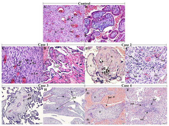 Histopathological analysis of the aborted materials detected an inflammatory environment: (A) abortion material from a healthy patient without any infectious disease history during pregnancy (control) showing decidual cells (DC) and (B) decidual vessels (DV) with the regular aspects. (C) Case 1 exhibiting decidua with mononuclear and polymorphonuclear—lymphocytes (Ly) and neutrophils (Nø) (D) and decidua with inflammatory infiltrate (Inf). (E) Case 2 with villous edema (E), the deposition of fibrinoid material (Fi) and calcification (C) (F) and decidua with intense inflammatory infiltrate. (G) Case 3 with dysmorphic villi with edema, focal areas of the deposition of fibrinoid material and calcification (H) and deciduitis. (I) Case 4 with intervillous space with inflammatory cells, villous edema and areas of the deposition of fibrinoid (J) and deciduitis. 10 µm = 1000×, 20 µm = 400×, 50 µm= 200×, 100 µm = 100×.