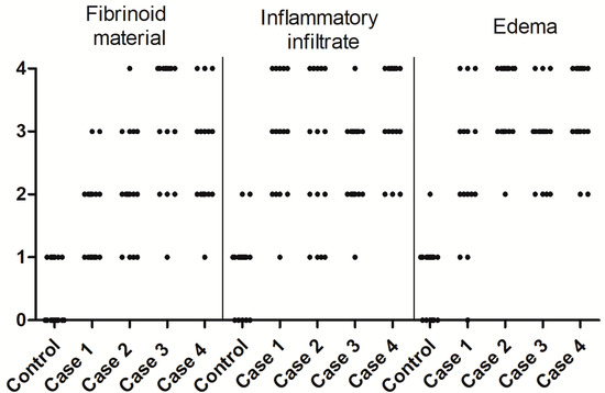 Quantification of the histopathological alterations. Fibrinoid material, inflammatory infiltrate and edema were quantified in the placental tissue of the control and cases 1, 2, 3 and 4 using an arbitrary scale with the following degrees: 0—absent, 1—light and focal, 2—light, 3—moderate and 4—diffuse.