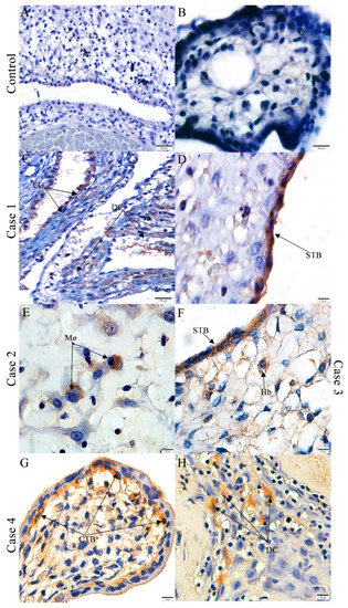 Using immunohistochemistry techniques, CHIKV antigen was detected in the in epithelial cells from the endometrial glands and in the decidual cells of case 1 (Figure 3C). Furthermore, the CHIKV antigen also was detected in some syncytiotrophoblasts of the chorionic villi (Figure 3D). In case 2, a positive immunodetection of the CHIKV antigen was seen in the decidual macrophages (Figure 3E). In case 3, the Hofbauer cells and syncytiotrophoblasts displayed reactivity for the CHIKV antigen (Figure 3F). Positive signals were observed in the cytotrophoblasts (Figure 3G) and decidual cells (Figure 3H) of case 4. As expected, no viral antigen detection was observed in the control (Figure 3A,B).