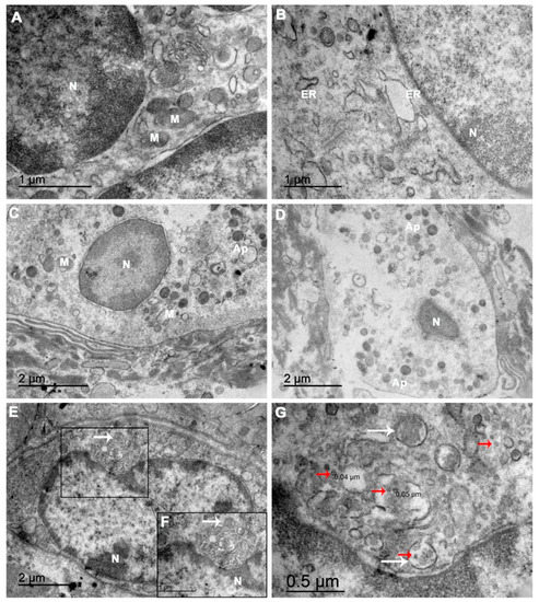 An electron microscopy analysis of the ultrathin abortion material sections showed damaged organelles and virus-like particles: (A) Electron micrographs of CHIKV-infected cells showing dispersed chromatin in the nuclei (N), mitochondria (M) with fewer cristae and (B) endoplasmic reticulum (ER) exhibiting dilated cisterns. (C) A decidual cell presenting a rarefied cytoplasm with an absence of organelles and starting to produce apoptotic bodies (Ap). (D) A decidual cell in apoptosis. (E,F) A cell with vesicles surrounding a cluster of virions in the cytoplasm (white arrows). (G) In the same field, at a higher magnitude, these CHIKV virus-like particles (red arrows) are located near a ruptured ER. The scale bar indicates that the particles are approximately 40–50 nm in size, consistent with the CHIKV.