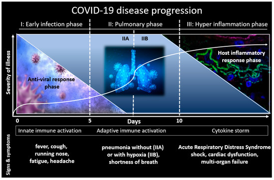 SARS-CoV-2 virus is an enveloped, positive-sense, single-stranded RNA beta-coronavirus [1,2,3,4,5,6]. The clinical progression of COVID-19 ranges from asymptomatic carriage to fulminant cytokine storm with respiratory failure, multi-organ dysfunction and ultimately death. It has been described that SARS-CoV-2 mediated inflammatory response has three different stages [5] (see Figure 1). Stage I, early infection, is characterized by increased cytokine and chemokine production. Stage I is the incubation period when SARS-CoV-2 multiplies and establishes residence in the host, primarily focusing on the respiratory system. Symptoms reported during Stage I are usually mild and often non-specific, including fever, cough, diarrhea, and headache. Stage II of COVID-19 infection, the pulmonary phase, is divided into two distinct parts: pneumonia without hypoxia (Stage IIA) or pneumonia with hypoxia (Stage IIB). During Stage IIB, symptoms worsen and patients will likely require hospitalization and oxygen supplementation. Stage III is the most severe stage, which manifests as an extrapulmonary systemic hyper inflammation syndrome, driven by the cytokine storm. Stage III is characterized by exuberant inflammation resulting from high circulating cytokines such as interleukin (IL)-6 and tumor necrosis factor alpha (TNF-α) [7,8,9,10,11,12]. These inflammatory mediators are responsible for the multi-organ damage, including acute respiratory distress syndrome (ARDS) and cardiac and renal dysfunction [13,14,15]. In general, the prognosis and recovery from Stage III are poor.