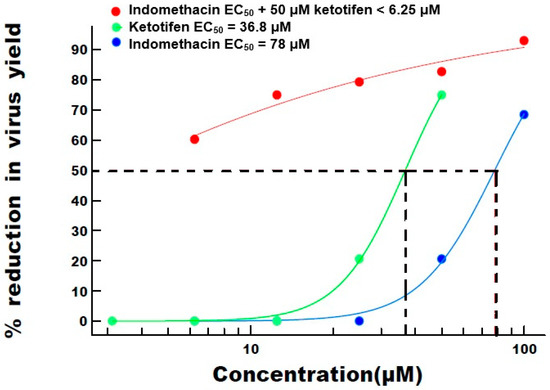 When ketotifen was added at a single concentration, naproxen’s ability to reduce virus yield was enhanced. The EC50 of naproxen was reduced to <6 μM, equating to ~17-fold greater effect in the presence of ketotifen. The dose–response curves are shown in Figure 2. These data indicate an additive or synergistic effect (See Figure 2).