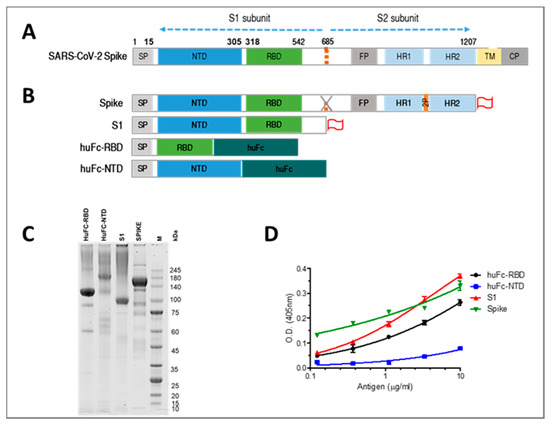 Mammalian cell codon optimized sequence, coding for SARS-CoV-2 spike glycoprotein based on the GenPept: QHD43416 ORF [https://www.ncbi.nlm.nih.gov/protein/1791269090]), was used to design pcDNA3.1+-based expression plasmids, mediating recombinant expression of the entire spike glycoprotein (amino acids 1–1207), RBD (amino acids 1–15 and 318–542), NTD (amino acids 1–305) and S1 (amino acids 1–685). The full expression vectors were obtained from Genscript (Piscataway, NJ, USA). A stabilized soluble version of the spike protein was designed by inclusion of the proline substitutions at positions 986 and 987, and disruptive replacement of the furin cleavage site RRAR (residues at position 682–685) with GSAS, as reported [32,33]. C-terminal his-tag, as well as streptag, were included in all constructs in order to facilitate protein purification. The recombinant proteins were expressed in CHO cells using ExpiCHOTM Expression system (Thermo scientific, Waltham, MA, USA) following purification using HisTrapTM (GE Healthcare, Uppsala, Sweden) and Strep-Tactin®XT (IBA Lifesciences, Goettingen, Germany). In addition, huFc-RBD and huFC-NTD-fused proteins were expressed using previously designed Fc-fused protein expression vector [34], giving rise to a protein comprising two RBD or NTD moieties owing to the homodimeric human (gamma1) Fc domain (huFc). Expression of the recombinant proteins was performed using ExpiCHOTM Expression system (Thermo scientific) following purification using HiTrap Protein-A column (GE healthcare). All purified proteins were preserved in PBS. The purity of each antigen was evaluated by SDS-PAGE gel under non-reducing conditions.