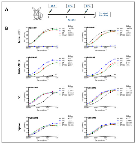 Treatment of animals was in accordance with regulations outlined in the U.S. Department of Agriculture (USDA) Animal Welfare Act and the conditions specified in the Guide for Care and Use of Laboratory Animals (National Institute of Health, 2011). Animal studies were approved by the local ethical committee on animal experiments (protocol number Rb-04-20). Female New Zealand white rabbits were maintained at 20−22 °C and a relative humidity of 50 ± 10% on a 12 h light/dark cycle, fed with commercial rodent chow (Koffolk Inc., Tel Aviv, Israel) and provided with tap water ad libitum. Rabbits were subcutaneously (sc) immunized with the 150 µg purified recombinant antigens human Fc-RBD (huFc-RBD), huFc-NTD, S1 or spike S1+S2 (two rabbits per antigen) in complete Freund’s adjuvant (CFA). Starting three weeks post primary immunization, rabbits were boosted twice in incomplete Freund’s adjuvant (IFA) at three week intervals. Terminal bleeding was performed 10 days post the final boost.