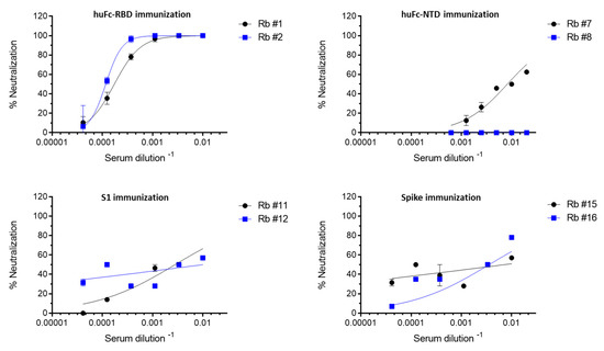 The humoral response profile of the immunized rabbits indicated that the high binding capacity determined against the different antigens used for immunization did not necessarily correlate with the resulting neutralization potency. The immunization with the spike ectodomain and the S1 elicited fewer neutralizing antibodies as RBD. This observation confirms previous reports demonstrating that the RBD immunogen by itself elicited the major pool of high affinity and neutralizing antibodies in a universal species-independent manner, while the immunogenicity of the spike and its counterpart S1 and S2 subunits vary depending on animal model, antigen structure and the immunization procedures [29,40,41,42].