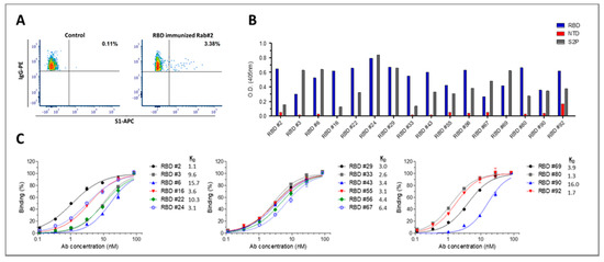 Isolation and characterization of anti-RBD antibodies. (A) Splenocytes were isolated from huFc-RBD-immunized rabbit 2 and were analyzed by flow cytometry using anti IgG-PE and APC Figure 1. IgG+/APC-S1+ B cells (located at the upper right quadrant and represented as percent out of total IgG+ cells) were single-cell sorted into 96-well microplates by FACSAria. Naïve rabbit PBMCs were analyzed as a negative control, demonstrating the specificity of the sorting strategy. (B) Specificity of the anti-RBD antibodies was determined by ELISA against the indicated SARS-CoV-2 proteins. Results are averages of duplicates from a representative experiment (out of two performed with similar results). (C) Binding profile of the antibodies determined by ELISA using RBD as the coating antigen. Data are presented as binding percent of Bmax for each antibody. The values represent average of triplicates ±SEM fitted by non-linear regression. The apparent KD (nM) value of each antibody is shown.