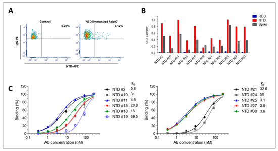 We next sought to isolate antibodies directed against non-RBD epitopes, which may also have the potential to neutralize the virus. The fact that rabbit 7, that was immunized with NTD, exhibited significant SARS-CoV-2 neutralizing activity, indicated that lymphocytes collected from this rabbit may serve as a good source for isolating such antibodies. Thus, flow cytometry for targeting specific anti-NTD IgG class-switched memory B cells was applied using a fluorescently labeled NTD (Figure 5A). Unique antibody sequences from 26 cells isolated by cell sorting were further cloned as a scFv-Fc format, of which 13 antibodies were found to bind S1. From this panel, 11 antibodies (with the highest binding properties against S1) were found to specifically bind NTD (Figure 5B). Analysis of the antibody binding profiles toward NTD enabled their classification into two affinity groups, the top 5 antibodies with apparent KD values of 3–6 nM and the rest exhibiting apparent KD values of 16–70 nM (Figure 5C). The top three antibodies were also characterized using BLI analysis that resulted in affinity values of 0.6, 7 and 16 nM for antibodies NTD25, NTD30 and NTD27, respectively (Supplementary Table S1). Over all, the results so far indicate the successful isolation of antibodies directed to RBD and NTD with high specificity and affinity.