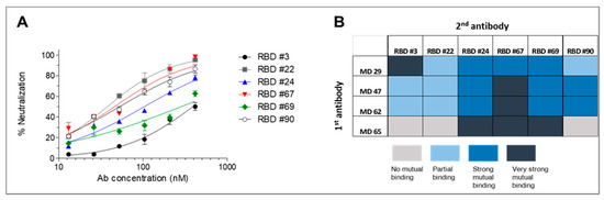 Classification of antibodies based on their specific targeted antigenic epitopes allows the integration of several non-competing antibodies in diagnosis and therapy procedures, potentially enabling improved pathogen capture and neutralization as well as mitigating the emergence of immune escape mutants. Recently, we reported the isolation of human neutralizing antibodies (MD29, MD47, MD62 and MD65) [18] that target four distinct epitopes within the RBD. It was therefore of interest to determine whether the novel anti-RBD neutralizing antibodies documented in the current report bind to the same or to different epitopes. Accordingly, biolayer interferometry (BLI) epitope binning was performed. Biotinylated human-derived antibodies were used to capture the RBD and the antibody-RBD complexes were then reacted with each of the novel antibodies. Simultaneous binding of the rabbit-derived antibody to RBD induces a wavelength shift whereas if the two antibodies bind the same or partially overlapping RBD epitope, no or very low wavelength shift, respectively, is expected. It was found that antibodies 3, 22 and 90 could not bind to the MD65-RBD complex (Figure 6B and Supplementary Figure S1). Interestingly, antibodies 24, 67 and 69 could bind to the RBD that was pre-associated with all MD antibodies, thus indicating the existence of a unique epitopes.