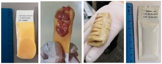 A sachet filled with the liquid vaccine virus (3 mL, 108.2 FFU/mL) was incorporated in two different bait types previously shown to be readily accepted by local free-roaming dogs in Thailand: an industrial manufactured egg-flavored bait (egg bait) and a locally produced intestine bait. As the study team observed that the acceptance of the egg bait could be further optimized, tuna- or chicken liver-flavored cat liquid snacks available in the local markets were pasted on one side of the outer surface of the bait immediately before offering the bait to the dog (egg+ bait), as seen in Figure 2.