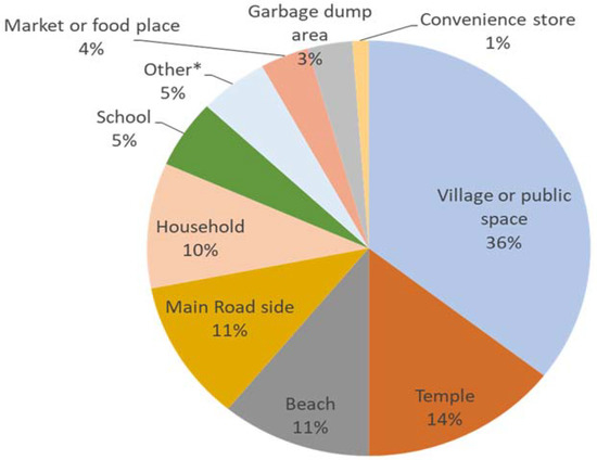 A total of 338 sites with an estimated 2444 free-roaming dogs in the five study areas were identified. The habitat-type of the sites where the dogs were offered baits is shown in Figure 3. The free-roaming dogs were most frequently found in four primary habitats characterized as village/public space (35.5%, 120/338), temple (14.5%, 49/338), beach (11.0%, 37/338), and main roadside (11.0%, 37/338), respectively.