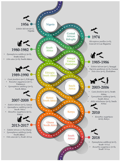 Timeline of laboratory confirmed Lagos bat virus detections.
