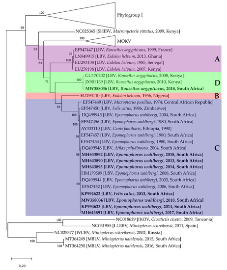 With the description of several viruses related to RABV during the mid-twentieth century, the Lyssavirus genus was initially divided into four serotypes, i.e., RABV (serogroup 1), LBV (serogroup 2), MOKV (serogroup 3) and DUVV (serogroup 4), based on reaction patterns with monoclonal antibodies [44]. Additional isolations of lyssaviruses followed and, together with improvements in molecular techniques for genetic characterization, led to the description of lyssavirus genotypes that followed the serogroup designation with an additional two genotypes [45]. During the 1990s, it was suggested that lyssavirus genotypes are divided based on a threshold nucleotide identity of 80% and 93% for amino acids [45,46]. The first comprehensive phylogenetic studies of LBV indicated that these viruses could be divided into three distinct lineages, i.e., lineage A–C. Viruses belonging to lineage A were also shown to exceed the genotype threshold compared to lineages B and C, suggesting that lineage A should constitute a new genotype [16,47]. It was also during this time that the ICTV approved the classification of lyssaviruses into species. This complex taxonomic entity would, therefore, consider several characteristics and not rely solely on genetic distance. Although LBV isolates exceed current genetic species demarcation criteria, it is not regarded as separate species [3]. An additional lineage D was also described from Kenya and more recently from South Africa (this report) with R. aegyptiacus as the only known associated host (Figure 4). The first full genome for LBV was only published in 2008, and currently, there are seven full genomes available with the first and only lineage C LBV genome (this report) available for comparison. The genetic identity for complete concatenated genomes ranged from 76% to 98.8% for nucleotides and 87.8% to 99.7% for amino acids (Table 4). It appears that LBV displays genetic spatiotemporal stability. For lineage A viruses, the only lineage with multiple full genomes available, that were detected 28 years apart from West and East Africa, less than 1.5% nucleotide divergence is observed. This suggests that the viruses of each lineage are adapted to specific hosts [10]. Due to limited surveillance in Africa, no conclusive assumptions can be made regarding the host range of LBV; however, available data suggest that lineage A and B viruses are associated with E. helvum, lineage C with E. wahlbergi and lineage D with R. aegytiacus.