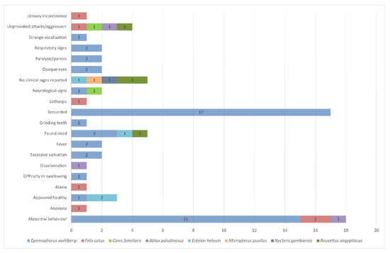 Reported clinical signs for animals naturally infected with Lagos bat virus.