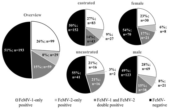 To determine the prevalence of FeMV infection in the geographic area of central Germany, the presence of antibodies against both FeMV genotypes wase evaluated. The data analyses revealed that 26% (n = 99) of the cats included in this study were serologically positive for FeMV-1. In addition, 8% (n = 29) of the cats were seropositive for FeMV-2 and 15% (n = 59) for both FeMV-1 and FeMV-2. Neither sex nor castration status were correlated with the presence or absence of FeMV antibodies (Figure 1).