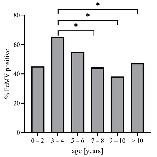 Correlation between the detection of FeMV antibodies in feline sera and the age of the animals. The percentage of seropositivity was calculated for each age group. p-values were determined using Fisher´s exact test: * p ≤ 0.05.