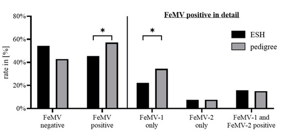 Association between FeMV antibody status and the cats’ breed. FeMV positivity was evaluated in general and for the particular antibody species detected. p-values were determined using Fisher´s exact test. * p ≤ 0.05.