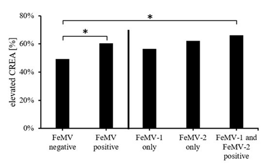 Due to the FeMV seroprevalence being very high in the population of cats investigated, possible clinical consequences of these infections were further studied. Of all individual cats analyzed, 55% (n = 208) had increased blood creatinine concentrations (>159 µmol/L). Within the group of FeMV-seronegative cats, the percentages of animals with increased vs. normal creatinine levels were almost equal (49% and 51%). Of the FeMV-seropositive animals, 60% (n = 113) had increased creatinine levels while 74 animals (40%) had creatinine concentrations within the reference values. Association testing revealed a significantly higher rate of azotemic cats (i.e., animals with increased blood creatinine levels) in the FeMV-positive group than in the FeMV-negative one (p = 0.0307). This association was predominantly caused by the FeMV-1 and FeMV-2 double-positive group (Figure 4).