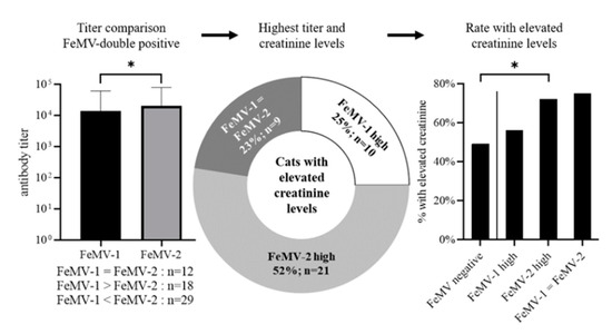 Next, antibody titers against both FeMV-1 and FeMV-2 were further evaluated for any potential association with the increased blood creatinine levels in the double-positive group of cats. On average, the titres against FeMV-2 were significantly higher (mean = 20,159) than those titres against FeMV-1 (mean = 14,105; p = 0.0256). Within the FeMV-double-positive group, 18 cats had higher titers for FeMV-1 than FeMV-2 (labeled ‘FeMV-1 high’), 29 cats had higher ertiters for FeMV-2 than FeMV-1 (labeled ‘FeMV-2 high’), and 12 cats exhibited equal titers against both FeMV genotypes (Figure 5, left panel).