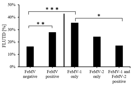 In contrast, a significantly (p = 0.006) higher portion of cats with FLUTD was found in the FeMV-positive group (52 in 187 = 28%) when compared to the FeMV-negative group (31 in 192 = 16%). Further, this positive association was mainly determined by the differences of FLUTD prevalence between the FeMV-1-only (35 in 99 = 35%) and the FeMV-negative group (p = 0.0003). Differences in FLUTD diagnosis between the FeMV-2-only (seven in 29 = 24%) vs. FeMV-negative (31 in 192 = 16%) and FeMV-1/2-double (10 in 59 = 17%) vs. FeMV-negative were not significant (p = 0.295 and p = 0.800, respectively). However, a significant difference (p = 0.0174) was found in the FLUTD prevalence between the FeMV-1-only and the FeMV-1/2-double group (Figure 6).