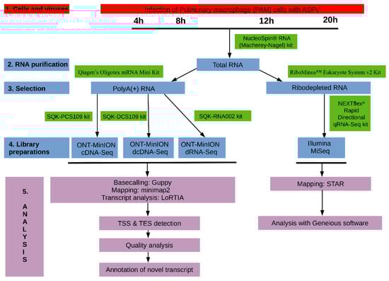 Wetlab and bioinformatics workflow used for the analysis of African swine fever virus (ASFV) transcriptome.