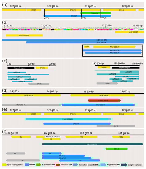 Examples for the ASFV transcript classes (a) 5′-truncated mRNAs. This part of the figure illustrates the putative nested mRNAs (CP312R.6; green arrow, embedded into the larger CP312R transcript; blue arrow) containing short 5′-truncated in-frame ORFs within the canonical ORFs (CP312R gene; yellow arrow). (b) Transcripts containing upstream ORFs MGF 300-2R transcript and its longer 5′-UTR isoform (MGF 300-2R-L) containing an uORF (yellow rectangle) is illustrated in this picture. The bracketed picture contains two full-length transcript isoforms (blue arrows), as well as the ORF of the gene encoding them and the uORF (yellow arrows). (c) Replication origin-associated RNAs This figure illustrates the repeat region at the genomic termini (black rectangle) and the raRNAs (turquoise arrows), which overlap or situated at the vicinity of the Oris, of which the precise location is unknown. (d) Antisense RNAs The red arrow indicates an asRNA (AS-MGF 360-9L) overlapping the MGF 360-9L gene (blue arrow) in opposite polarity. (e) Polycistronic RNAs CP80R-CP312R bicistronic transcript (light green arrow) comprising two tandemly oriented genes, of which the CP312R is also expressed as a monocistronic RNA molecule (blue arrow). (f) Complex transcripts The I9R-I10L-L11L complex transcript (dark green) comprises three genes, of which I9R (encoding three TSS isoforms; blue arrows) stands in an opposite orientation compared to the other two genes (L11L.2 and I10L).