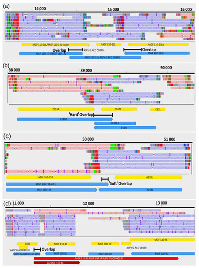 Examples for transcription overlaps of ASFV RNA molecules. (a) parallel overlaps, (b) convergent "hard" overlap (c) convergent "soft" overlap, (d) divergent overlap.